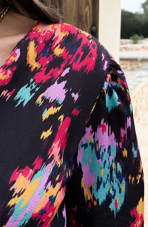 Product: WOW! Met deze jurk zijn alle ogen op jou gericht! De zwarte jurk met multicolor print is voorzien van een bijpassend lint om te strikken in de taille en sierlijke ruches.