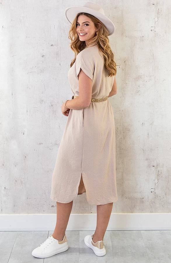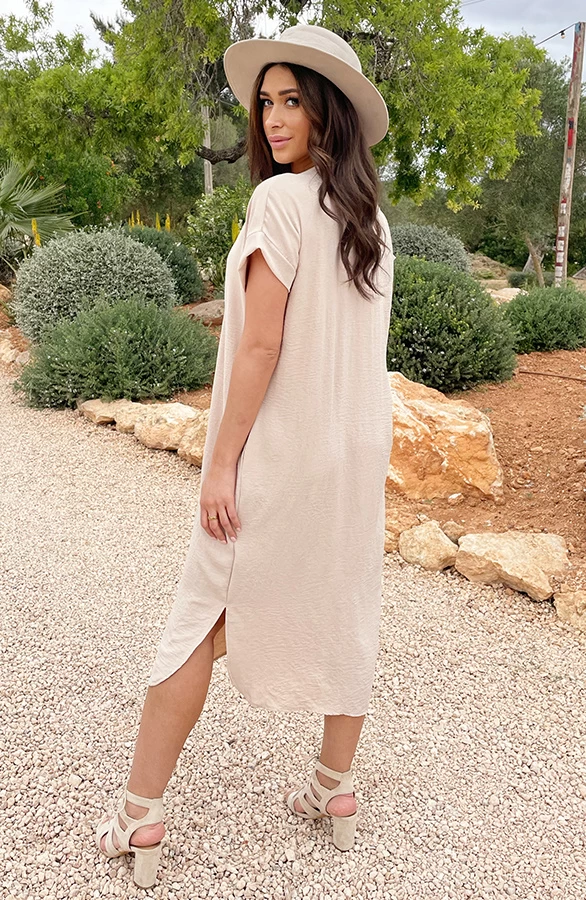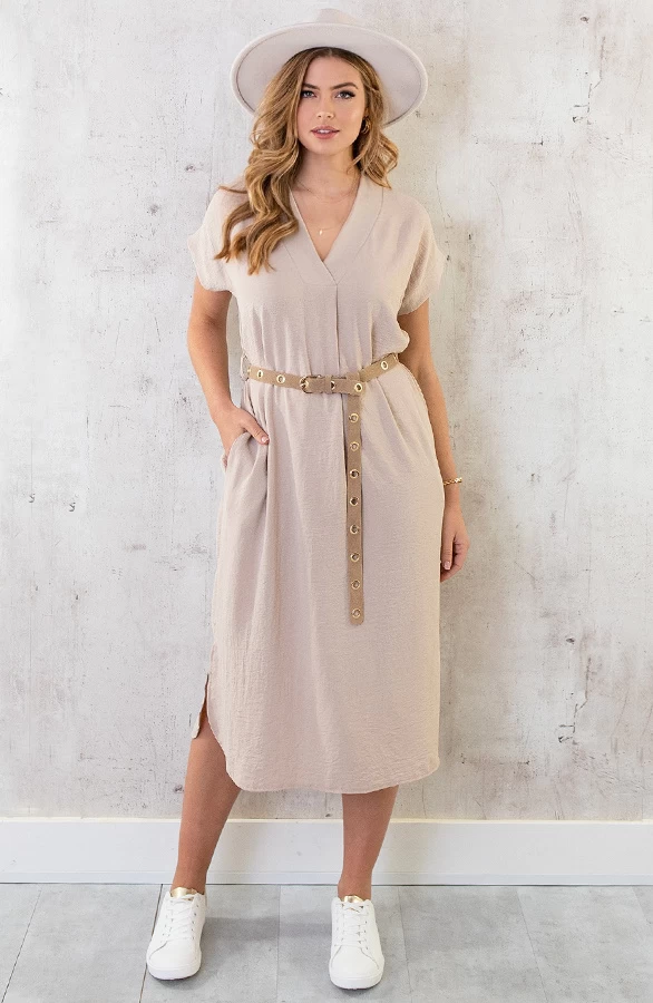 Product: Deze beige jurk is perfect voor meerdere gelegenheden! De midi jurk met steekzakken is voorzien van een v-hals en een oversized pasvorm.