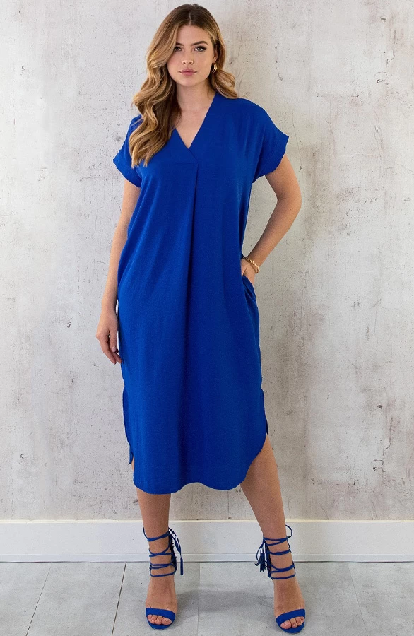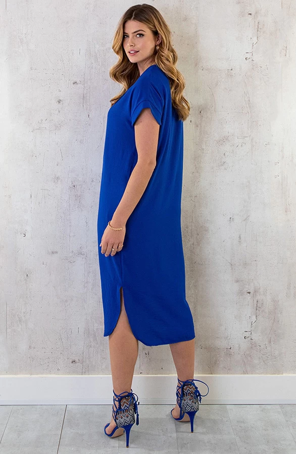 Product: Wauw! Deze kobaltblauwe jurk is een echte eyecatcher! De jurk is voorzien van splitjes aan de zijkanten. Draag de jurk met een stoere tailleriem zodat jouw figuur …