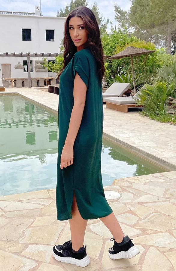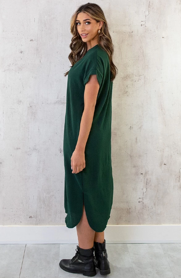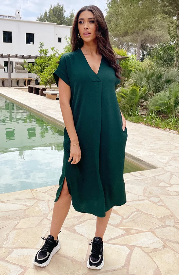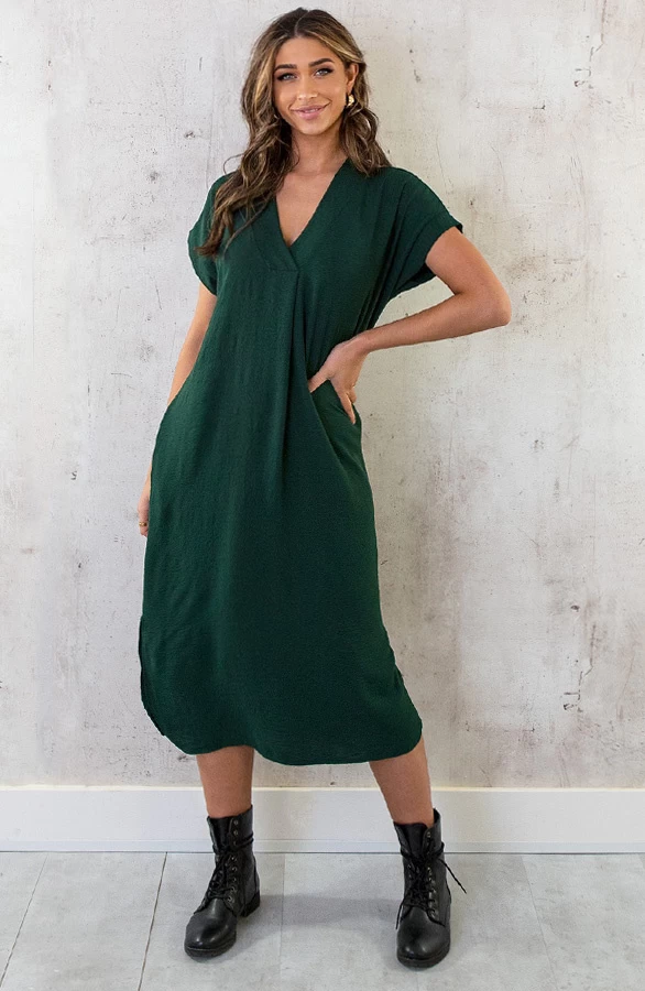 Product: Deze smaragdgroene jurk behoort tot onze bestsellers! De Palermo Jurk is voorzien van een v-hals, steekzakken en splitjes aan de zijkant.