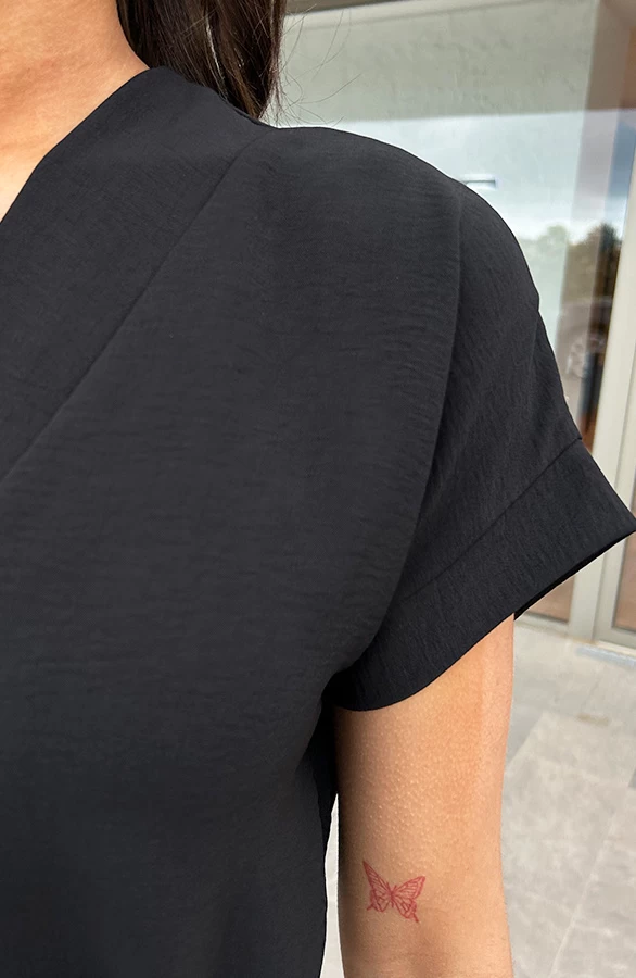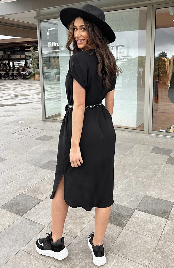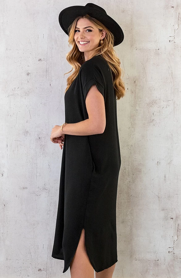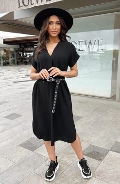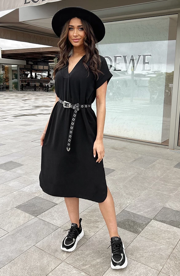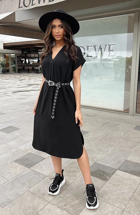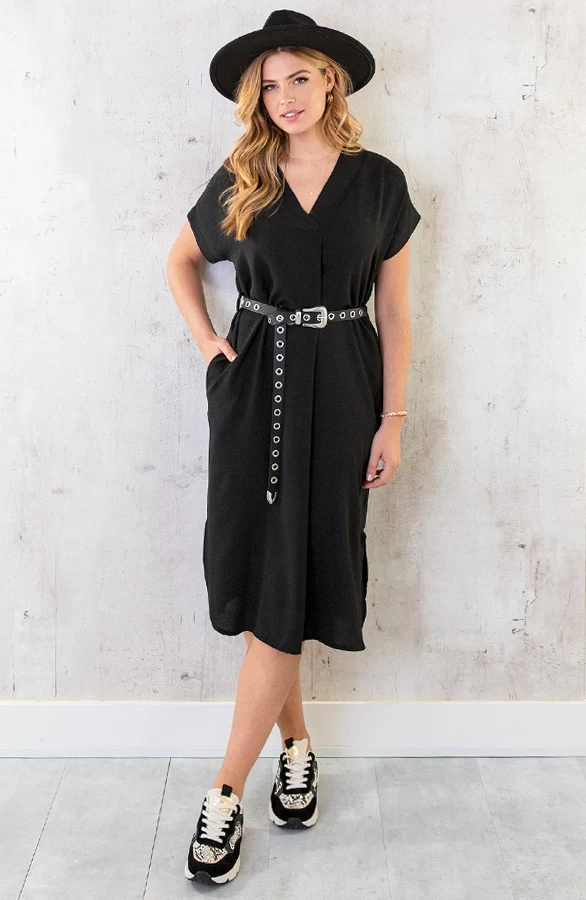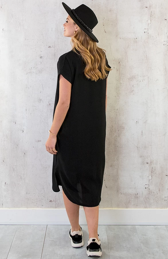 Product: Een zwarte jurk is onmisbaar in jouw garderobe! Deze jurk is voorzien van een v-hals en steekzakken.