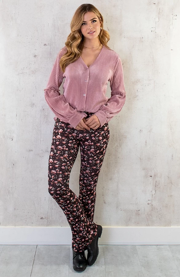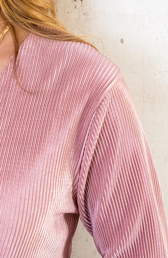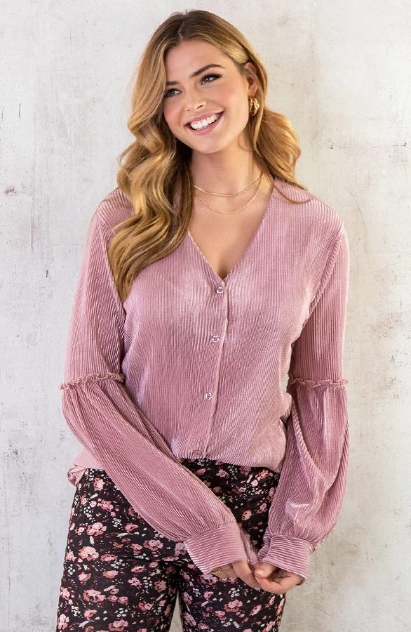 Product: Hoe leuk is deze roze plisse blouse?! De blouse is voorzien van sierlijke ruches op de mouwen en een knoopsluiting.