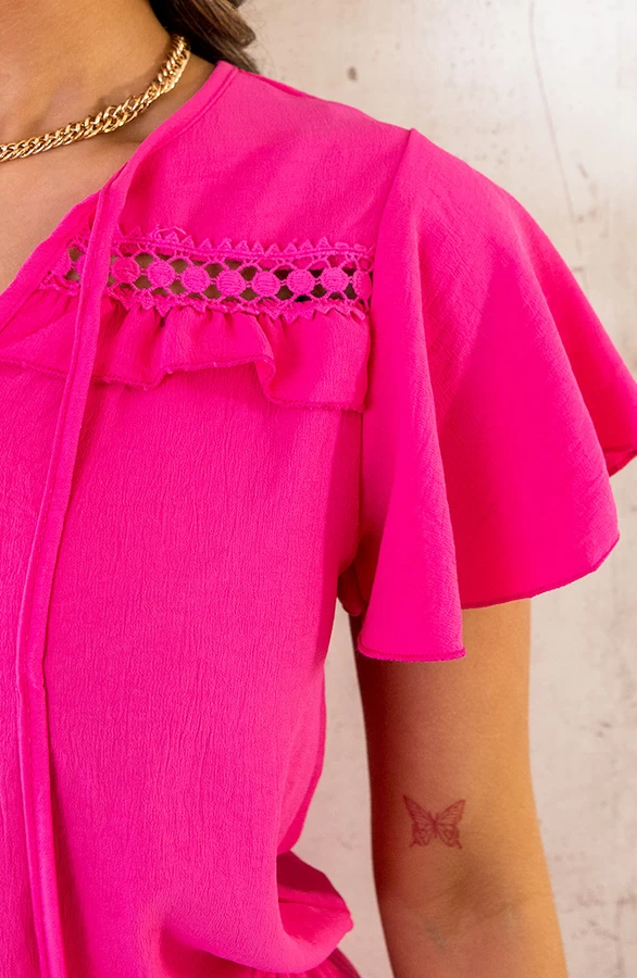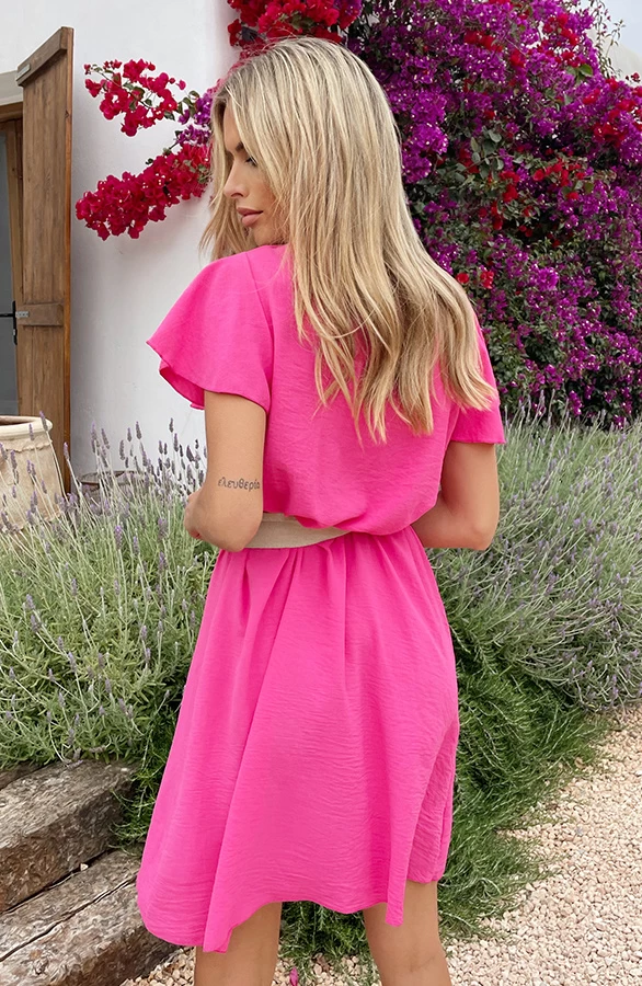 Product: Wauw! Steel de show met deze fuchsia dress! De jurk heeft schattige details boven de borst en té leuke vleermuismouwen.