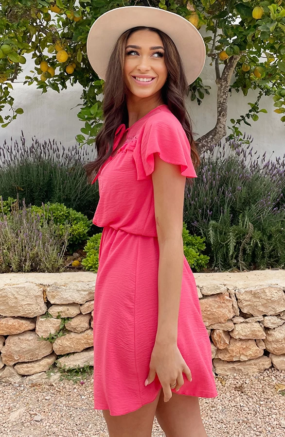 Details: v-hals, korte mouwen, ruches, vleermuismouwen en elastiek in de taille Materiaal: 100% Polyester