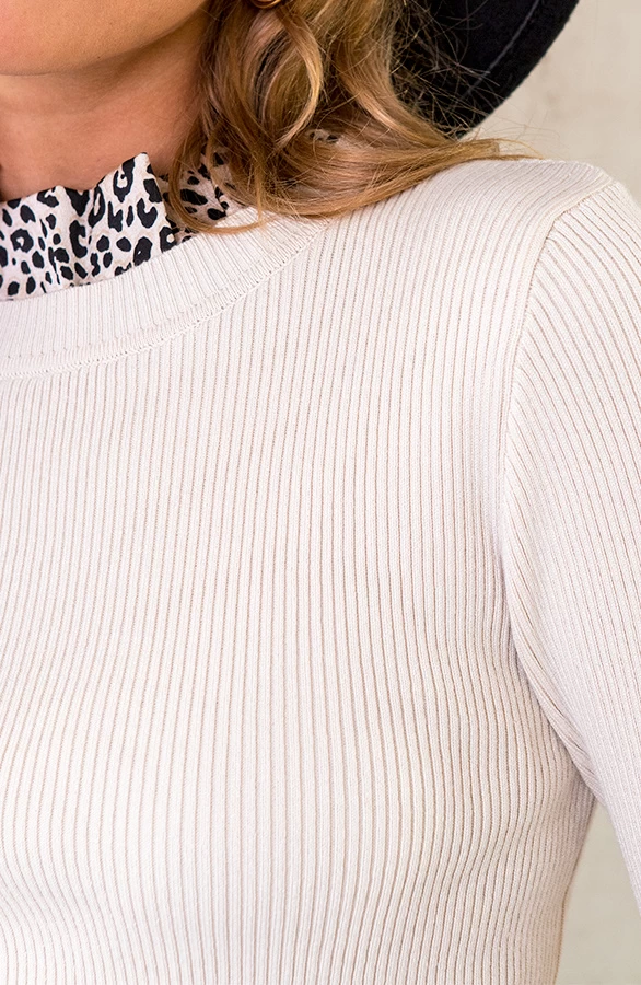 Product: Hoe gaaf is deze ribstof trui?! De trui is gemakkelijk te combineren met een skinny jeans en is voorzien van panterprint bij de kraag en de polsen. We LOVE IT!