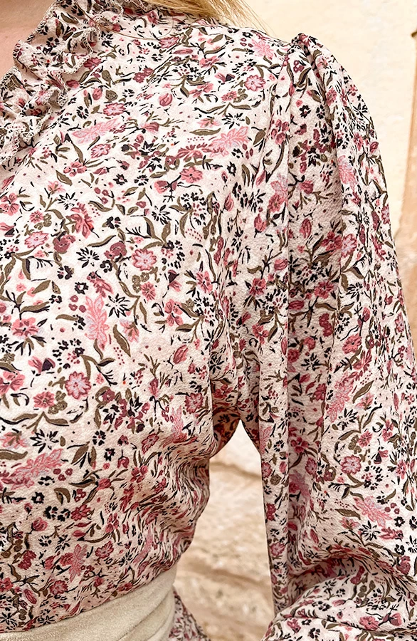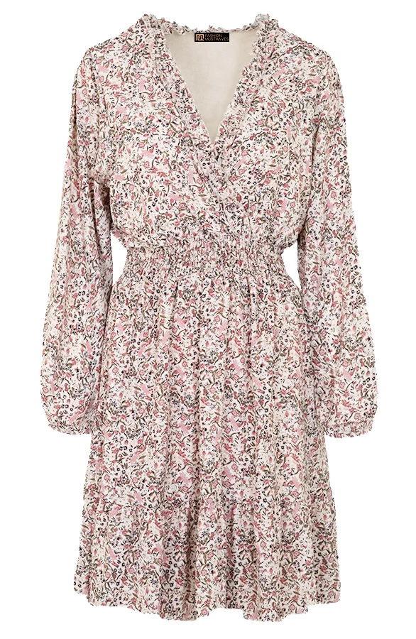 Details: v-hals, lange mouwen, ruches, onderjurk, bloemenprint, elastiek in de taille en elastiek bij de mouwen
