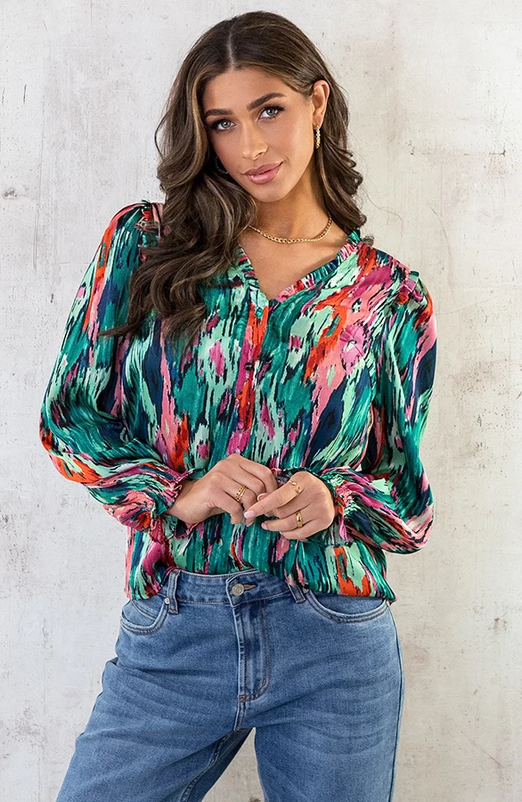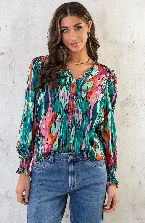 Product: Bestseller! Deze kleurrijke blouse vrolijkt jouw hele garderobe op! De blouse is voorzien van een knoopsluiting en een glanzende stof.