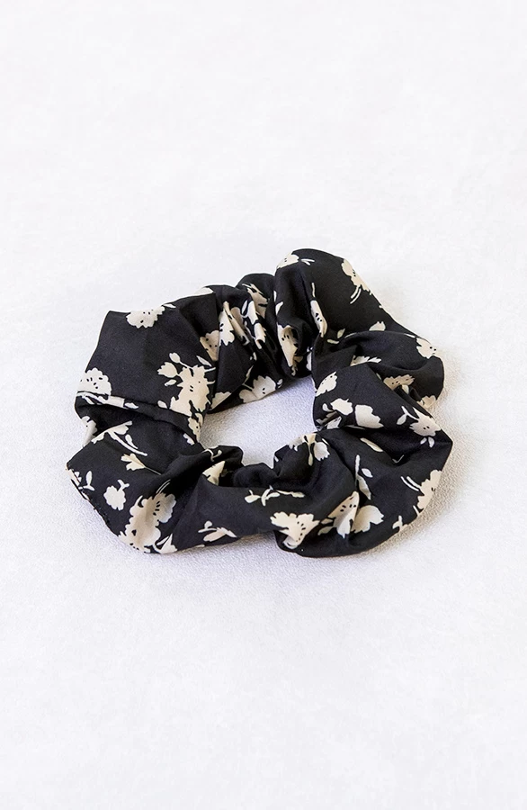 Product: Flower up your hairlook met deze scrunchie! De scrunchie is voorzien van een bloemenprint en glanzende stof.