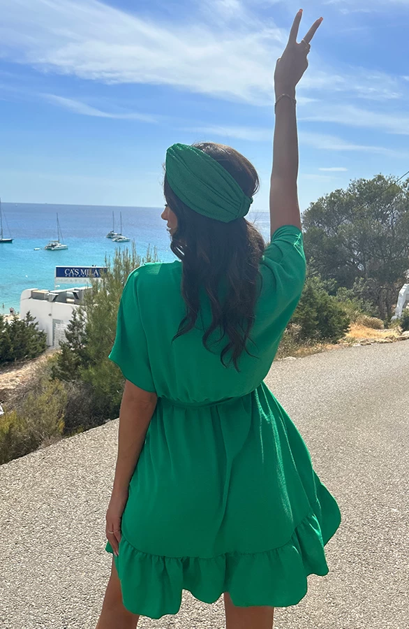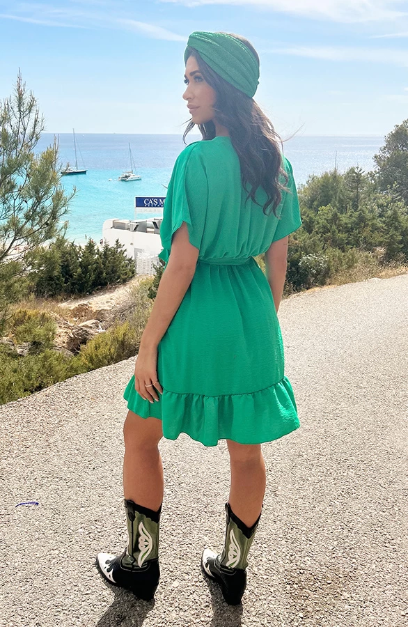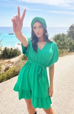 Product: Wij zijn fan van deze jurk! De jurk is voorzien van vleermuismouwen, een v-hals en elastiek in de taille. Ook verkrijgbaar in andere kleuren!