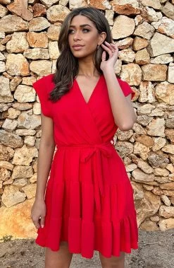 Product: Lady in red! Dit rode v-hals jurkje is een aanwinst voor jouw garderobe! Het a-lijn jurkje is voorzien van elastiek in de taille en een lint om te strikken.