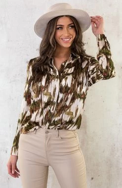 Product: Hoe gaaf is deze legergroene blouse met print?! De blouse is voorzien van een knoopsluiting en een glanzende stof.