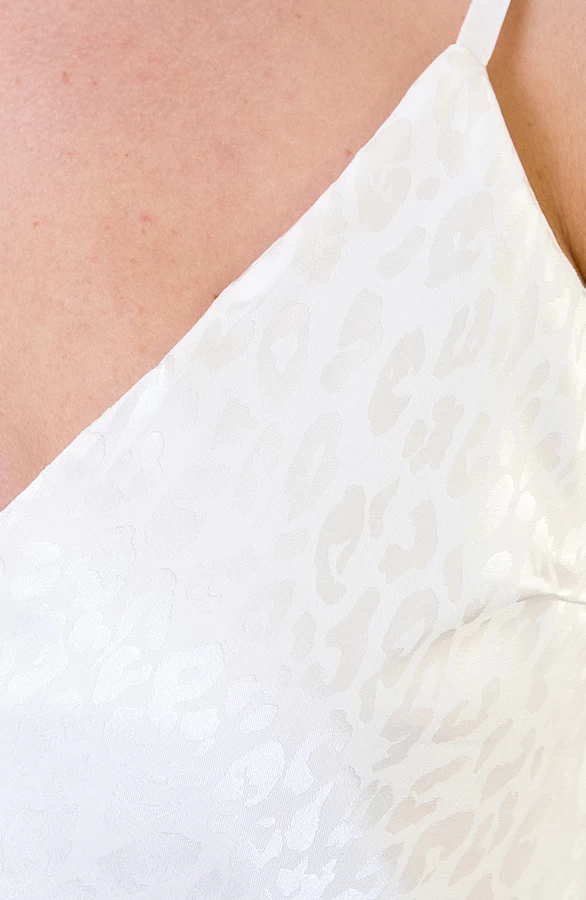 Details: glanzende stof, panterprint, v-hals aan voor- en achterkant, ondertop en verstelbare spaghettibandjes Materiaal: 100% Polyester