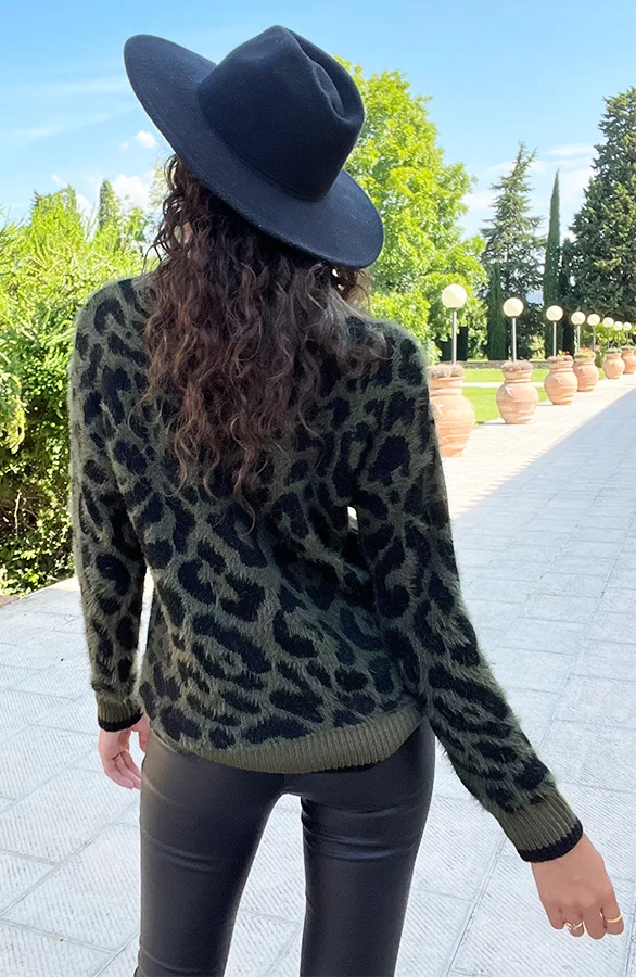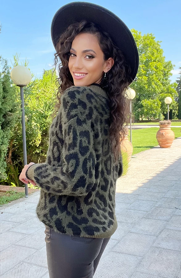 Details: ronde hals, lange mouwen, gebreid, stretch, panterprint en zachte stof Materialen: 50% Polyester, 50% Acryl