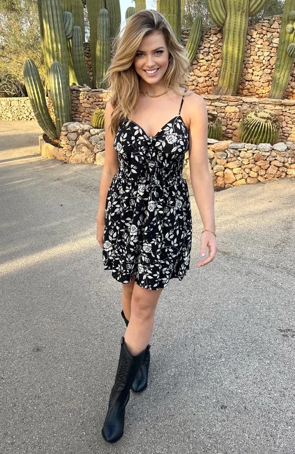 Details: elastieken band, v-hals, bloemenprint, elastiek in de taille en verstelbare spaghettibandjes Materialen: 65% Viscose, 35% Katoen