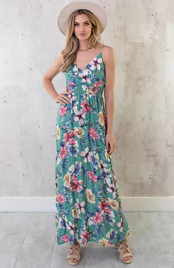 Details: v-hals, bloemenprint, elastiek in de taille en verstelbare spaghettibandjes Materialen: 65% Viscose, 35% Katoen