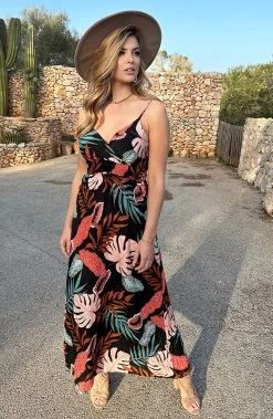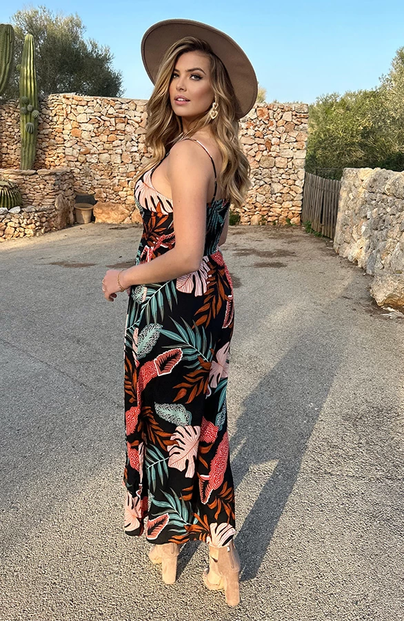 Product: Wie wilt deze fijne jurk nou niet?! De jurk met tropical print is voorzien van spaghettibandjes en elastiek in de taille.