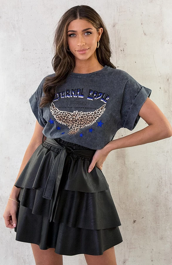 Details: verwassen look, ronde hals, korte mouwen, print op de voorkant, panterprint en tekst op de voorkant Materiaal: 100% Katoen