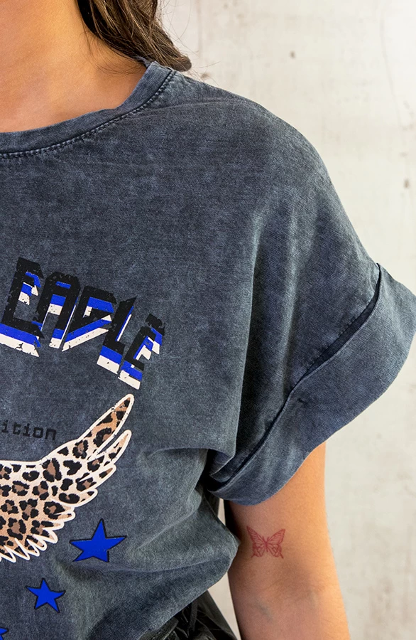Product: Deze top is een echte eyecatcher! Het t-shirt heeft een verwassen look en is voorzien van panterprint en kobaltblauwe details.