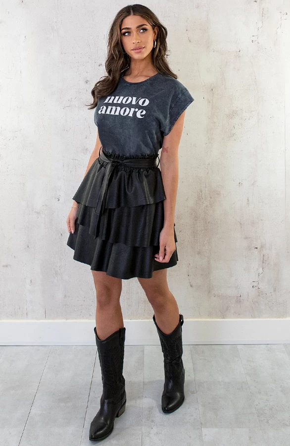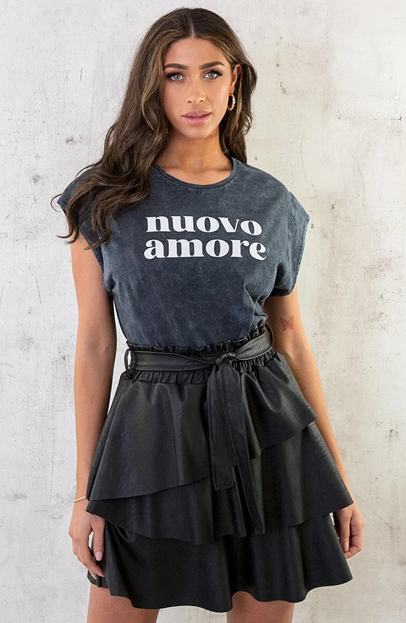 Product: Deze top met verwassen look is een aanwinst voor jouw garderobe! De katoenen top is voorzien van een tekst op de voorkant.