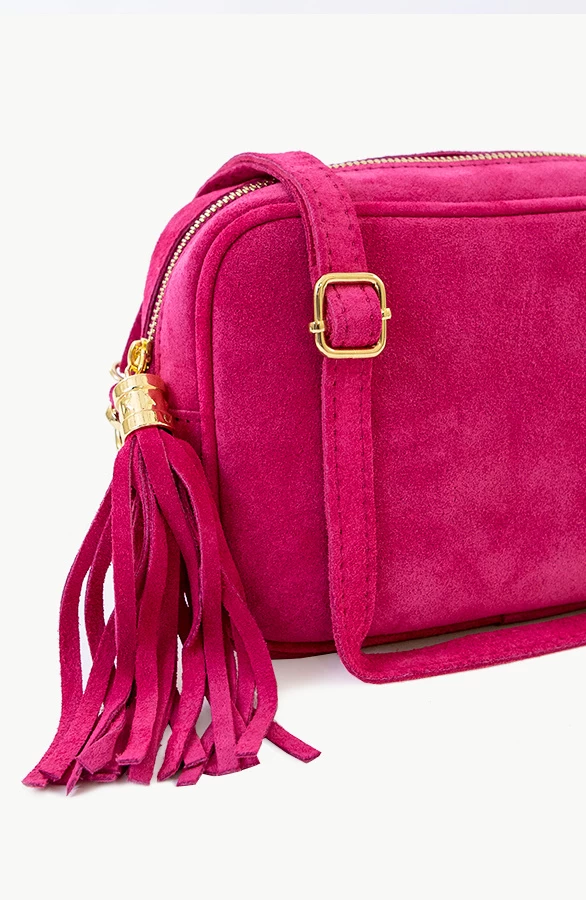 Product: OH-MY! Deze tas maakt je look helemaal af! Deze suede tas heeft een ritssluiting met een kwastje eraan en is voorzien van een hengsel.