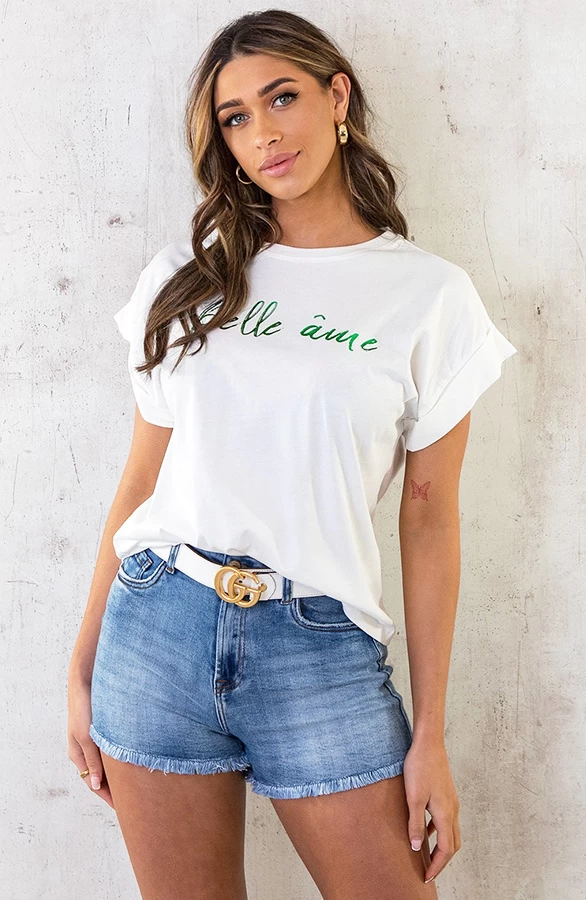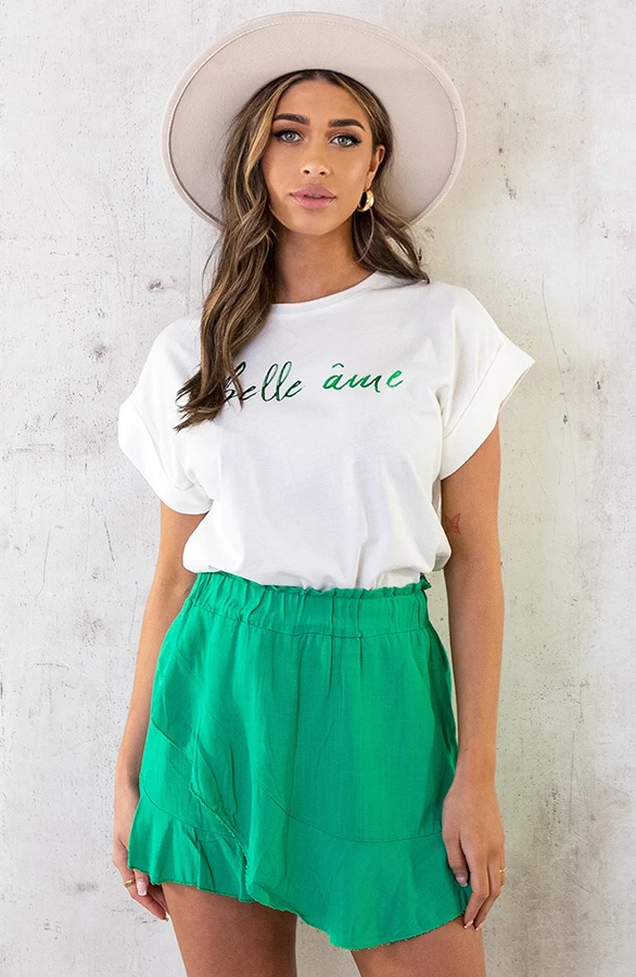Product: Deze top is de perfecte basis voor een fashionable look! De katoenen top is voorzien van metallic groene tekst op de voorkant.