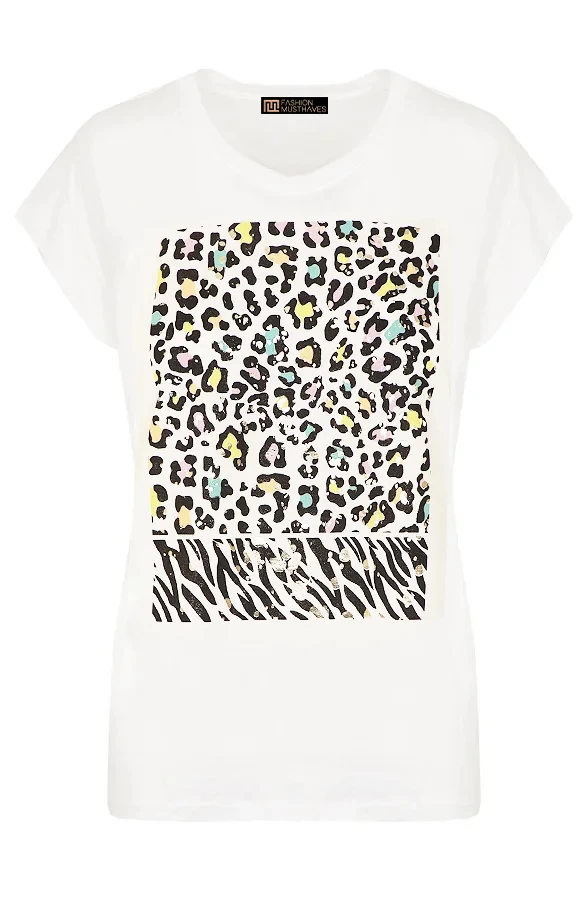Product: Deze top wil je niet missen! De top met gekleurde dierenprint is echt een musthave! De top is voorzien van een korte hals en korte mouwen.
