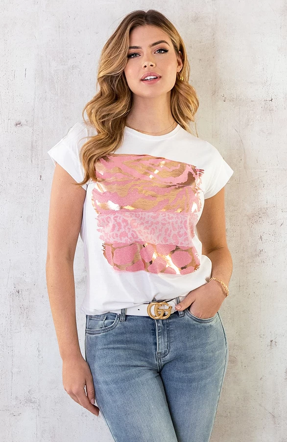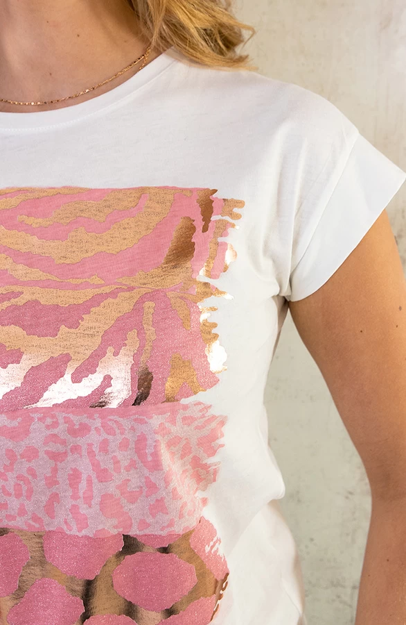 Details: ronde hals, korte mouwen, zebraprint, panterprint, metallic stof en glitters Materiaal: 100% Katoen