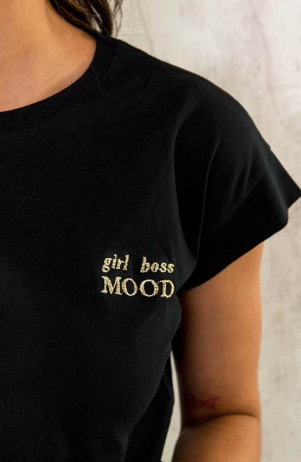 Product: Deze top is de perfecte basis voor een fashionable look! De zwarte top is voorzien van de tekst ‘girl boss mood’ op de borst.