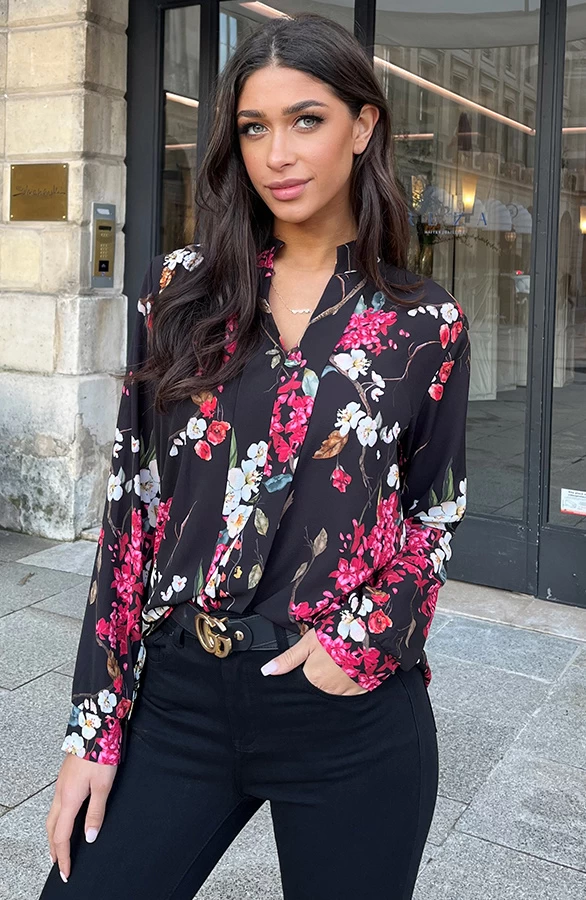 Product: Deze prachtige blouse is ideaal voor verschillende gelegenheden! De v-hals blouse is voorzien van een mooie bloemenprint en een bies op de voorkant.