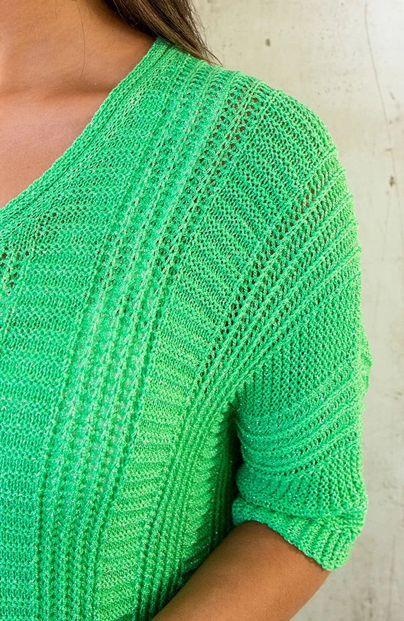 Details: v-hals, korte mouwen, gehaakte stof en lurex Materialen: 12% Nylon, 88% Acryl