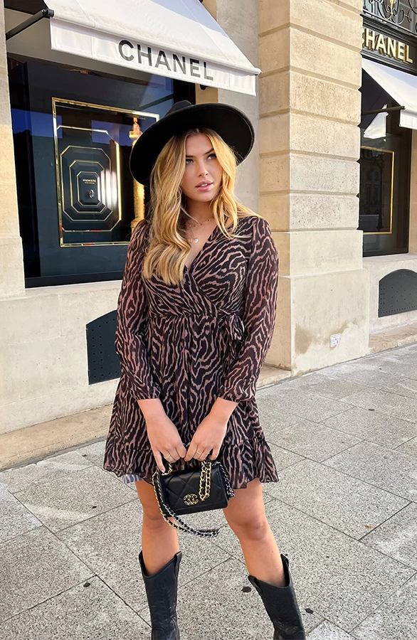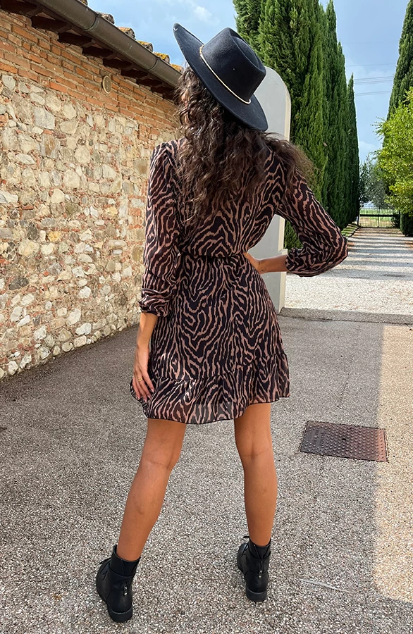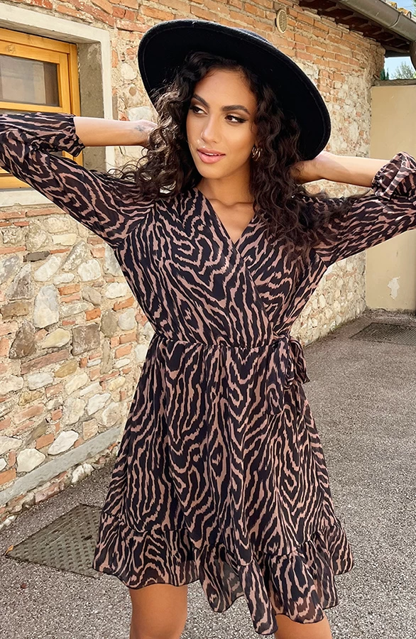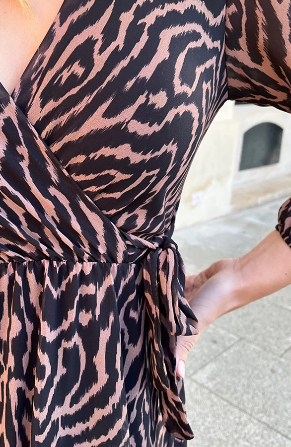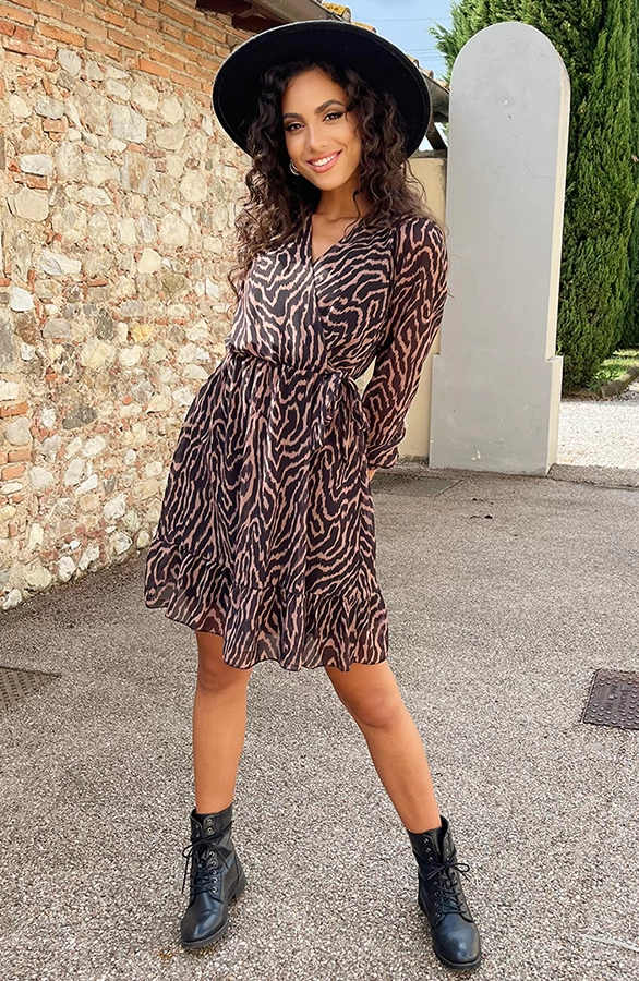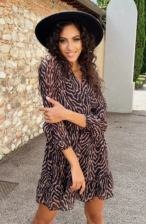 Product: Deze camelkleurige jurk is voorzien van een super leuke zebraprint en een v-hals. We love it!