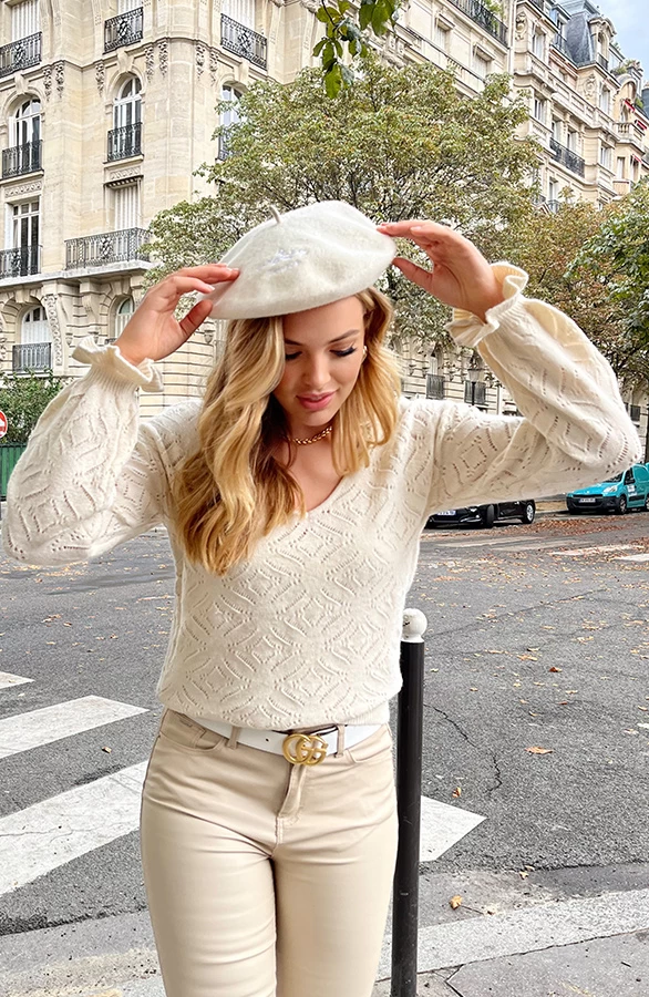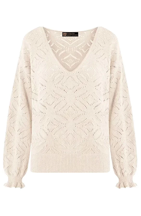 Product: Ohlala.. Deze gebreide trui met ruffles bij de mouwen is super fashionable! De trui is voorzien van een gehaakt patroon en elastiek bij de mouwen.