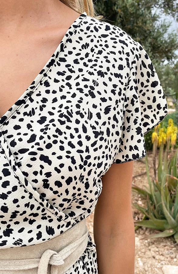 Details: v-hals, korte mouwen, ruches, lint om te strikken, overslag en cheetahprint Materiaal: 100% Polyester
