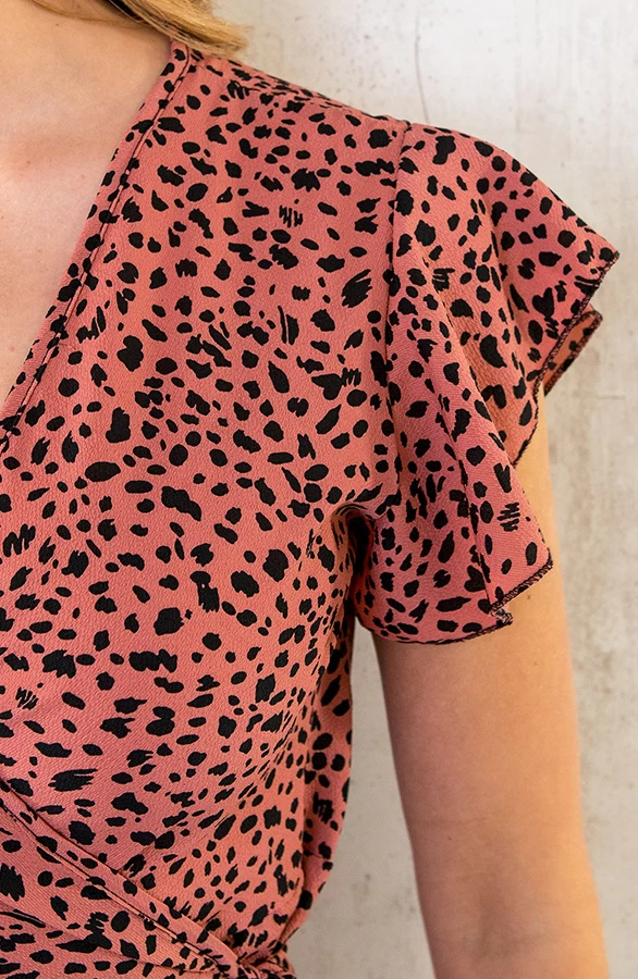 Details: v-hals, korte mouwen, ruches, lint om te strikken, overslag en cheetahprint Materiaal: 100% Polyester