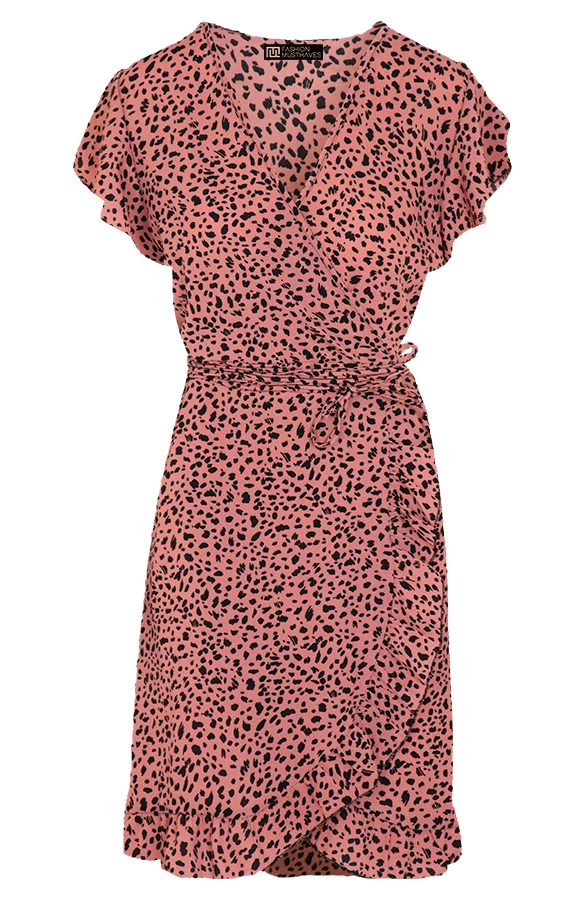 Product: Wij zijn fan van cheetahprint! Dit overslag jurkje is voorzien van korte mouwen en een lint om te strikken.