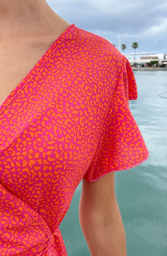Details: v-hals, korte mouwen, ruches, lint om te strikken, overslag en panterprint Materiaal: 100% Polyester