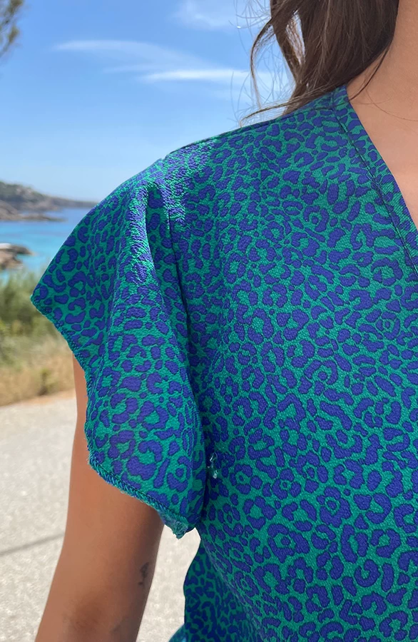 Details: v-hals, korte mouwen, ruches, lint om te strikken, overslag en panterprint Materiaal: 100% Polyester