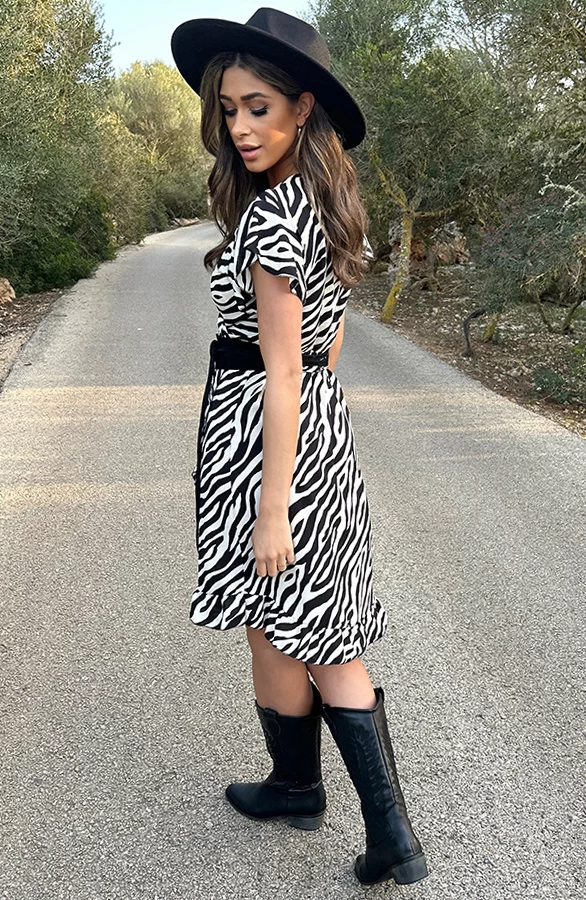 Product: Deze jurk is altijd een goed idee! De jurk met zebraprint is voorzien van korte mouwen en ruches.