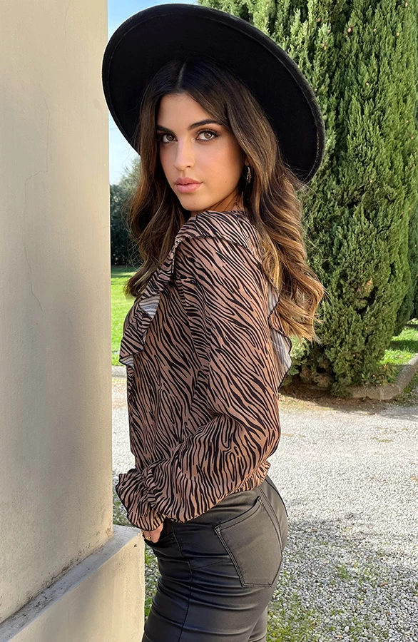 Details: v-hals, ruches, zebraprint en elastiek bij de mouwen Materiaal: 100% Polyester